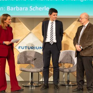 „Künstliche Intelligenz bildet die kognitive Leistung des Menschen auf Computern ab. Bei Spezialleistungen ist sie stark, von einer generellen menschlichen Intelligenz aber meilenweit entfernt.“ Wolfgang Wahlster, Chef-Berater des Deutschen Forschungszentrums für Künstliche Intelligenz (DFKI) und Mitglied im Lenkungskreis der Plattform Lernende Systeme, setzte in einem einführenden Gespräch einen Rahmen zum technologischen Stand. In vielen Bereichen wie etwa der Medizin kann KI schon heute den Menschen wirksam unterstützen. „Wichtig ist nun, die Schnittstellen zu klären und aus der Black-Box etwas Transparentes zu machen“, so Stefan Brandt, Direktor des im September 2019 eröffneten Futurium.