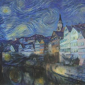 Ein bekanntes Beispiel ist eine nächtliche Stadtansicht, die im Stil von van Goghs „Sternennacht“ generiert wurde: Die Häuserzeile, der Fluss, die Kirche – all das bleibt klar erkennbar. Gleichzeitig verwandeln sich Farben, Strukturen und Lichtstimmungen. Über dem Motiv liegen der charakteristische Wirbelhimmel, die kräftigen Pinselstriche, die leuchtenden Kontraste des berühmten Gemäldes.