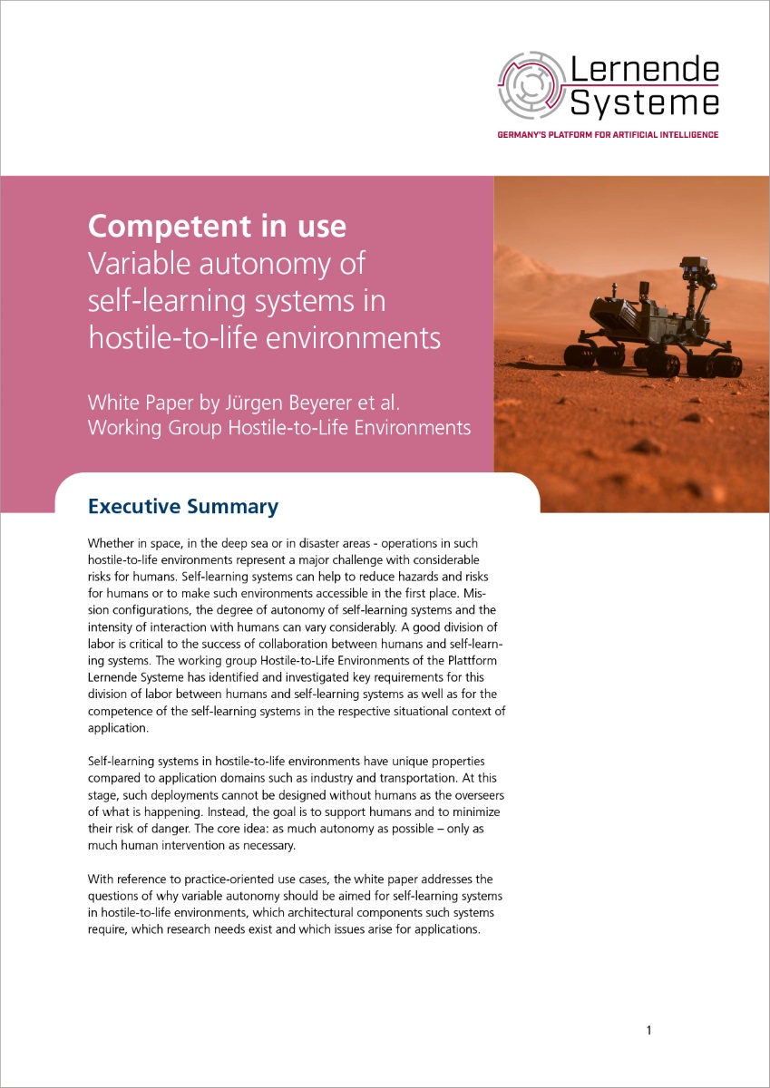 The working group "Learning Robotic Systems" is dedicated to the benefits and potential of learning robotic systems for business and society. It also addresses challenges and control possibilities of such systems and outlines possible business models.